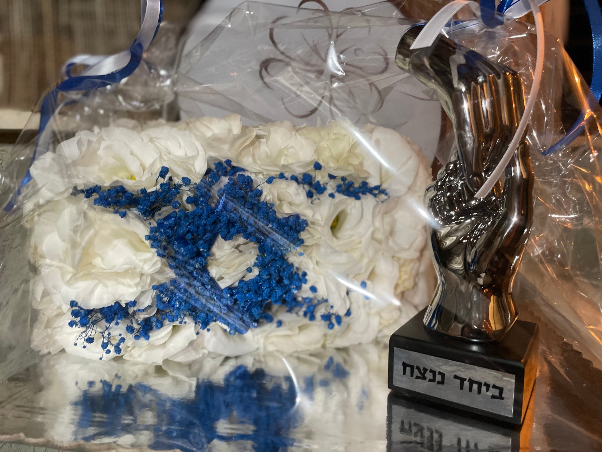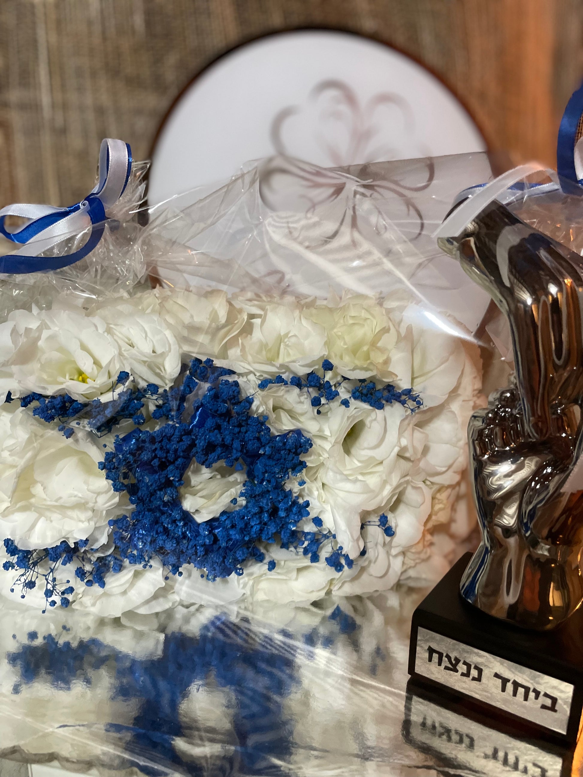 Israeli flag made of white and blue flowers, made as set with "holding hands" (not included in the price). For a quote please contact.